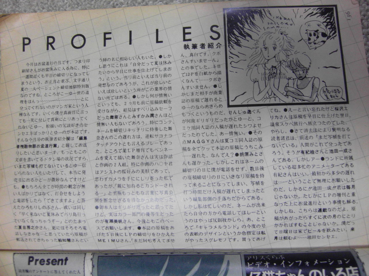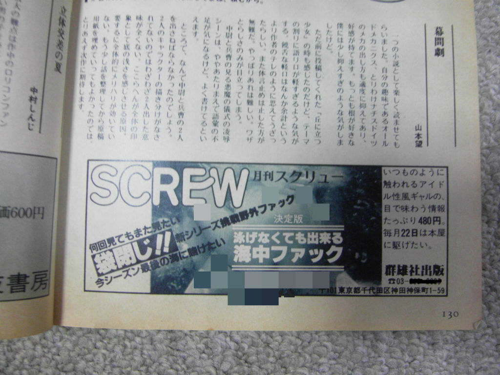 自社広告は酷いのでモザイクをかけておくが、80年代らしい需要がまったく関係ない特集。なんのためにやっているのだろうか。他、ヘイバディ(実写系ロ◯写真雑誌)、ぱふ(まんが情報誌)、マンガハウス(さくまあきらがやっていて漫画専門店のみで販売されていた漫画家養成同人風商業誌)などの広告が出ている。たぶん雑誌業界がもっと中央にあった頃によく相互広告として使われた手段、いわゆる交換広告といわれるバータータダ広告ではないかと思われるが、一般漫画情報誌のぱふが参加するという時点で、当時の漫画業界のある程度のメインストリームであったことと、横のつながりを考えさせられる。